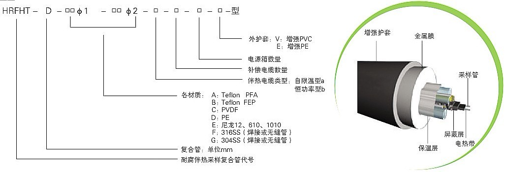 耐腐采樣伴熱復(fù)合管是環(huán)保監(jiān)測系統(tǒng)中的重要部件,它是由一組耐腐高性能樹脂導(dǎo)管輔以自限溫伴熱帶以及補償線纜組成內(nèi)芯,外加保溫層,最后敷以阻燃聚乙烯(PE)保護外套復(fù)合而成。自限溫伴熱帶的自動限溫功能,可以保證采樣管內(nèi)維持一定的溫度,從而盡可能保證采集樣品與初始值保持一致,最終確保環(huán)保監(jiān)測系統(tǒng)連續(xù)、正確地采集樣氣。根據(jù)采集樣氣的成份、溫度等實際情況,耐腐伴熱采樣復(fù)合管中采樣導(dǎo)管可以選用不同的材質(zhì),如PFA(四氟乙烯與全氟烷基醚共聚物)、FEP(四氟乙烯和六氟丙烯共聚物)、PVDF(聚偏二氟乙烯)、PE(阻燃聚乙烯)、尼龍610等等, 伴熱帶可以選用中、低、高溫度伴熱帶,另外還可以根據(jù)用戶要求添加補償導(dǎo)線、電源線等 。