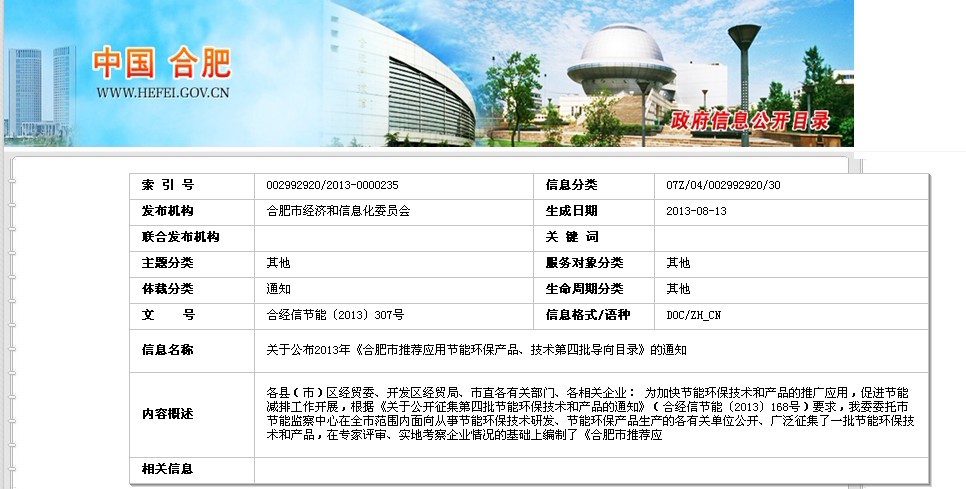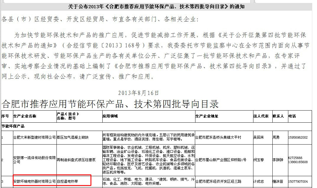 環(huán)瑞作為合肥經(jīng)濟(jì)科學(xué)建設(shè)道路上的重要成員,一直朝著“科技環(huán)瑞,電熱成就世界”的偉大藍(lán)圖邁進(jìn),其具有低電阻過(guò)渡層的自限溫電伴熱產(chǎn)品先后獲得省,市關(guān)于科技成果的榮譽(yù)有:合肥市科學(xué)技術(shù)獎(jiǎng),安徽省高新技術(shù)產(chǎn)品,合肥重點(diǎn)名牌產(chǎn)品。國(guó)家7項(xiàng)專利證書。其環(huán)保節(jié)能的特點(diǎn)已經(jīng)獲得政府、行業(yè)協(xié)會(huì),及市場(chǎng)的認(rèn)可。目前,環(huán)瑞公司已通過(guò)了合肥市推薦應(yīng)用節(jié)能環(huán)保產(chǎn)品、技術(shù)目錄的公示,獲得了環(huán)保節(jié)能產(chǎn)品稱號(hào),以下為合肥經(jīng)濟(jì)和貿(mào)易信息化委員會(huì)網(wǎng)站的公示內(nèi)容: