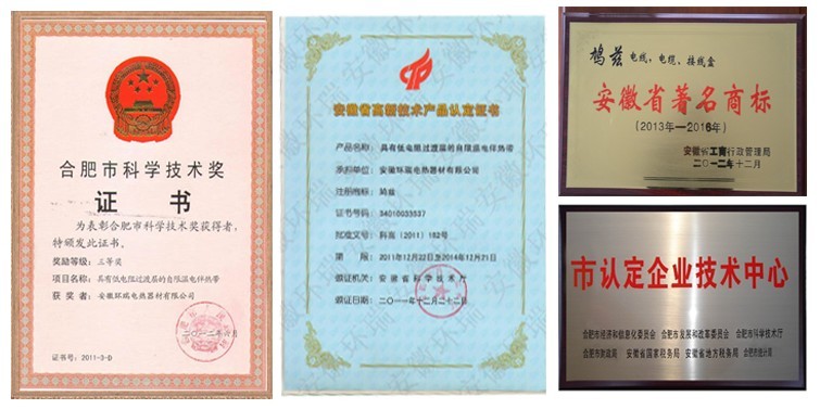 安徽環(huán)瑞擁有21項(xiàng)自主知識(shí)產(chǎn)權(quán),其中包括:2項(xiàng)國(guó)家發(fā)明專利;4項(xiàng)新型電伴熱帶、發(fā)熱電纜生產(chǎn)核心技術(shù)(1、雙層共擠技術(shù),2、束代絞預(yù)恒張力絞線,3、一體化熱線冷線隱式拼接,4、三層共擠技術(shù));5項(xiàng)核心新型產(chǎn)品(1、具有低電阻過渡層的電伴熱帶,2、一種安全塑料體的電伴熱帶,3耐高溫耐磨的發(fā)熱電纜,4、太陽能熱利用電伴熱帶,5、新型長(zhǎng)距離并聯(lián)、串聯(lián)恒功率電熱帶);10項(xiàng)行業(yè)專用電伴熱帶(消防專用電伴熱帶、電廠煙氣脫硫?qū)S秒姛釒А⑻柲軣崴鞅举|(zhì)安全型電熱帶、石油管道伴熱專用電熱帶、汗蒸房專用電熱帶、天溝融雪專用發(fā)熱電纜、混凝土養(yǎng)護(hù)專用發(fā)熱電纜、畜牧養(yǎng)殖專用發(fā)熱電纜等)。安徽環(huán)瑞憑借此項(xiàng)榮譽(yù)獲得了省科學(xué)技術(shù)獎(jiǎng)、高新技術(shù)產(chǎn)品證書及國(guó)家地暖行業(yè)、省建設(shè)廳榮譽(yù)推廣證書。