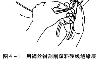 芯線截面為4mm,及以下的塑料硬線,其絕緣層用鋼絲鉗剖削,具體操作方法:根據所需線頭長度,用鉗頭刀口輕切絕緣層(不可切傷芯線),然后用右手握住鉗頭用力向外勒去絕緣層,同時左手握緊導線反向用力配合動作,如圖4-1所示。
