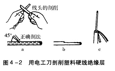 (1)根據所需的長度用電工刀以45°角斜切入塑料絕緣層,如圖4一2a所示。