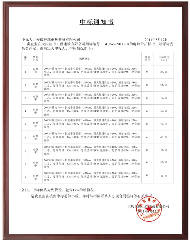 喜報!安徽環瑞在總公司領導的關懷下、在以優秀經理徐紅兵同志為帶領的大慶辦事處全體員工的辛勞下,經過不懈努力,在與全國各地20余家同行業企業的競爭中,脫穎而出,于2011年7月30號拔得頭籌,中標成功!成為大慶油田建設集團卓越中標單位、大慶油田石油管理局入網單位!