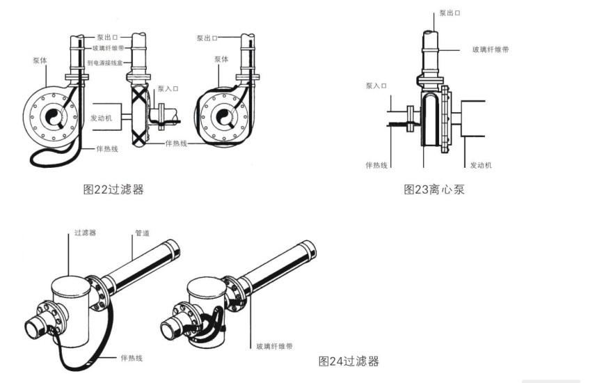 以上復雜管線電伴熱安裝前夕,需根據(jù)現(xiàn)場不同管徑,長度,計算熱損耗。確定電伴熱安裝比例與電伴熱帶米數(shù)(其中泵,過濾器,儀表等其他管道附件,需預留數(shù)量)。根據(jù)管道的配備相應的電源接線盒,鋁箔膠帶,熱敏膠帶與不銹鋼帶等。其閥門,泵,過濾器,儀表電伴熱帶安裝圖列參照下圖。