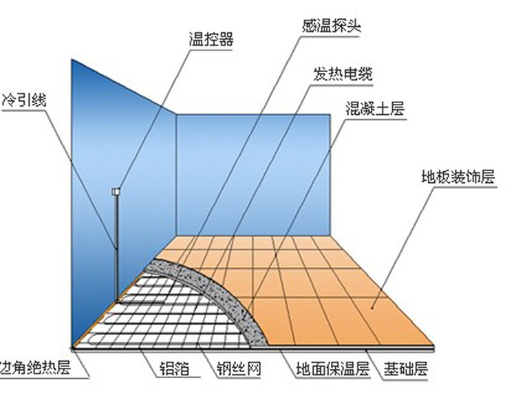 發熱電纜采暖系統由發熱電纜和溫控器兩部分組成,發熱電纜鋪設于地面中,溫控器安裝于墻面上。當室內環境溫度或地面溫度低于溫控器設定的溫度時,溫控器接通電源,發熱電纜通電后開始發熱升溫,發出的熱量被覆蓋著的水泥層吸收,然后均勻地加熱室內空氣,還有一部分熱量以遠紅外輻射的方式直接釋放到室內。該種方式的采暖系統把整個地面作為散熱器,室內溫度上層低而下層高,有溫足而頂涼的感受,使您感到舒適而自然。