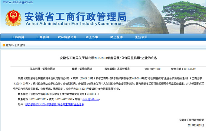 安徽省工商行政管理局網(wǎng)站的公告信息: