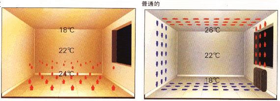 ◆熱量集中分布在1.8米以下人體活動的主要區域,同等體感效果其室溫可比空調和暖氣等低3—5℃,節省能耗達30%以上;